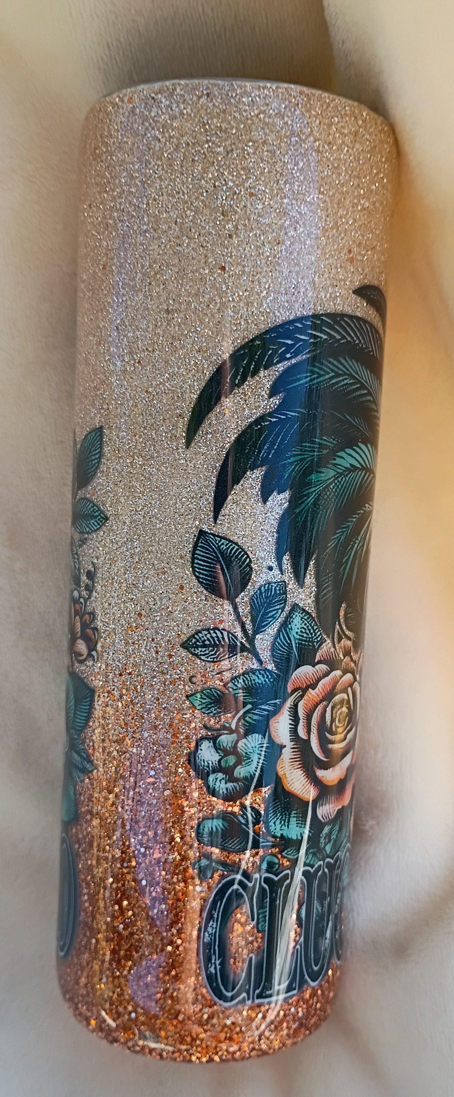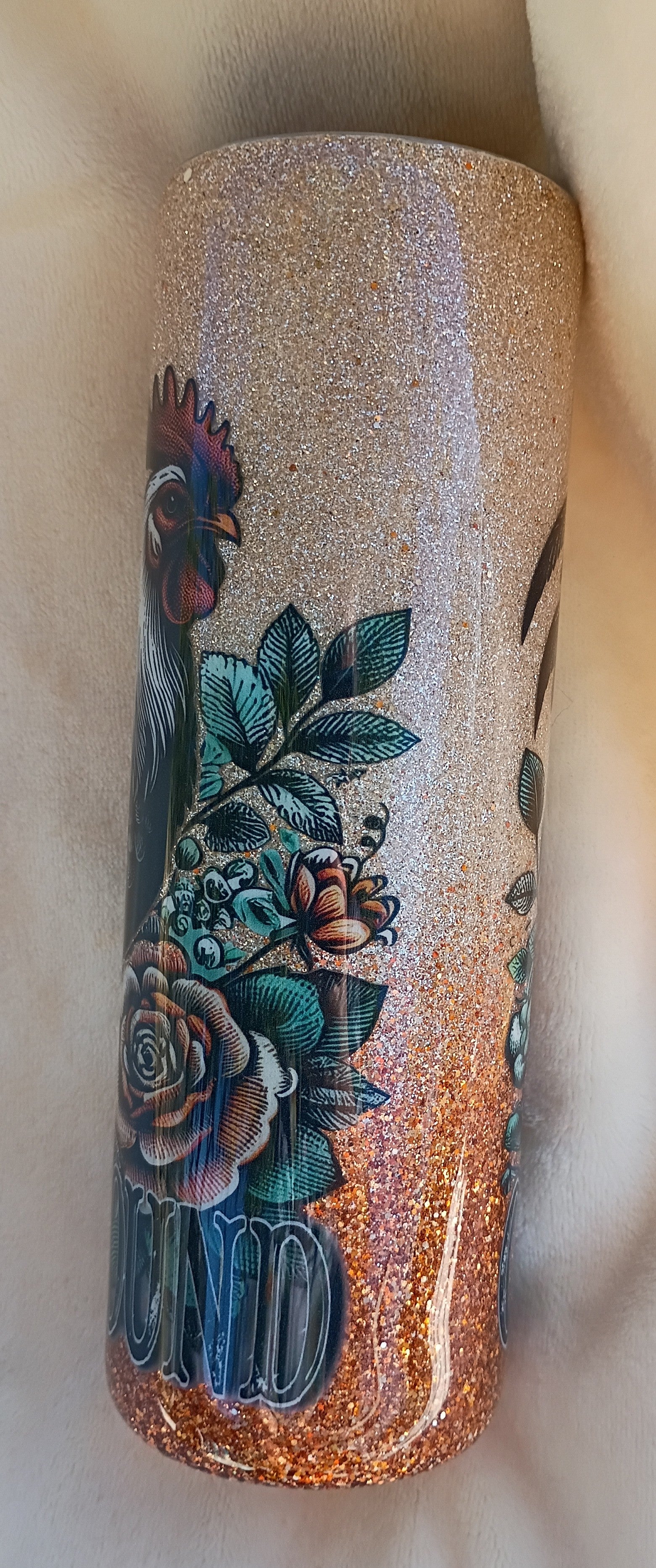 This 30oz HOGG straight tumbler features a gorgeous cream-to-gold ombré glitter base that shines with every sip. The look is topped off with a UV DTF chicken decal that’s just the right mix of funny and fabulous — because let’s be real, sometimes you just need to tell the world to quit cluckin’ around!
