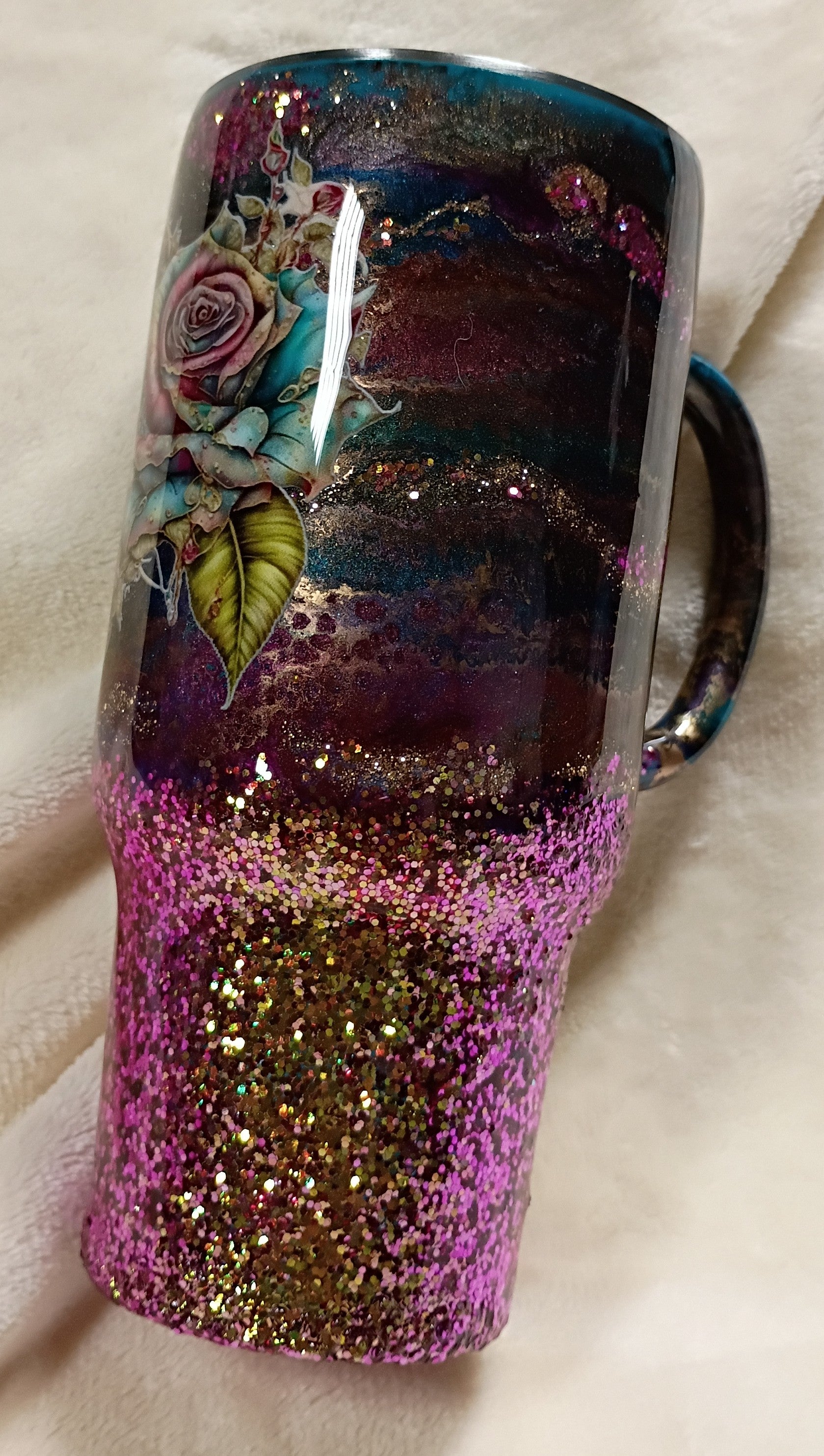 Turn heads with our Rosy Glow 24 oz Tipsy Magnolia tumbler — a stunning blend of Southern charm and modern shimmer. Created with the junk in the trunk technique, this beauty features a color-shift glitter base that shifts from soft pink to radiant gold, catching the light with every turn. A delicate rose decal adds the perfect finishing touch, tying together warmth, elegance, and handcrafted detail.